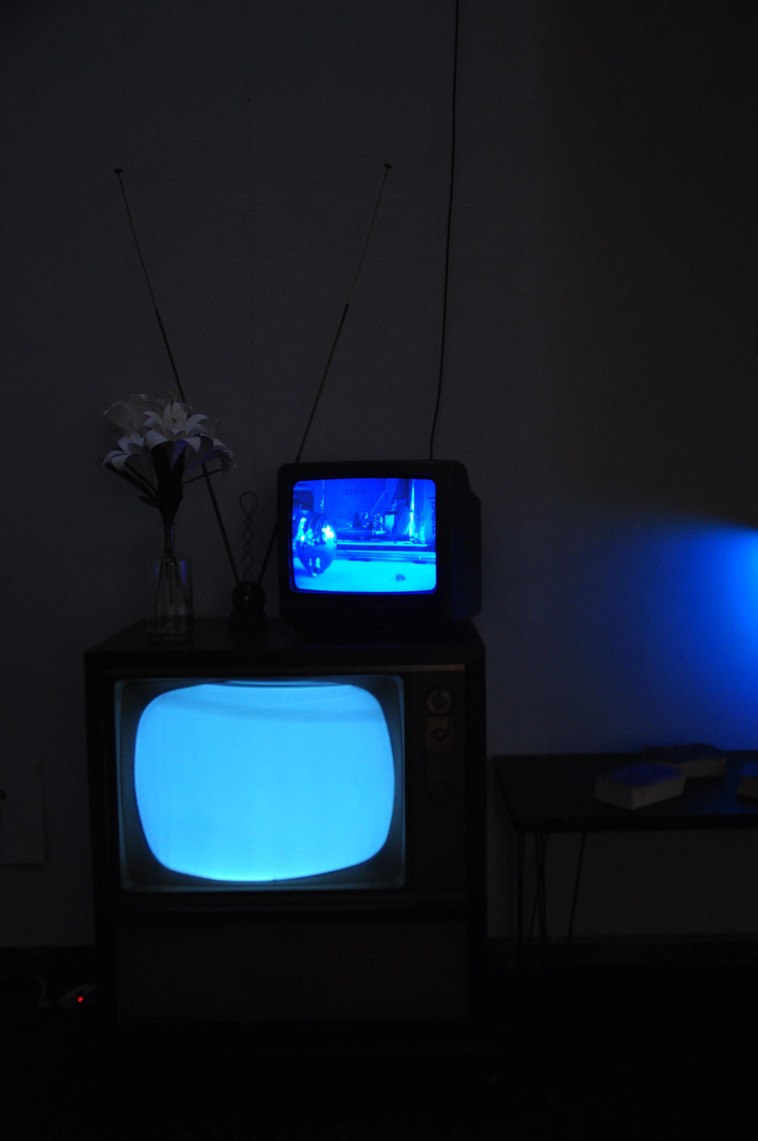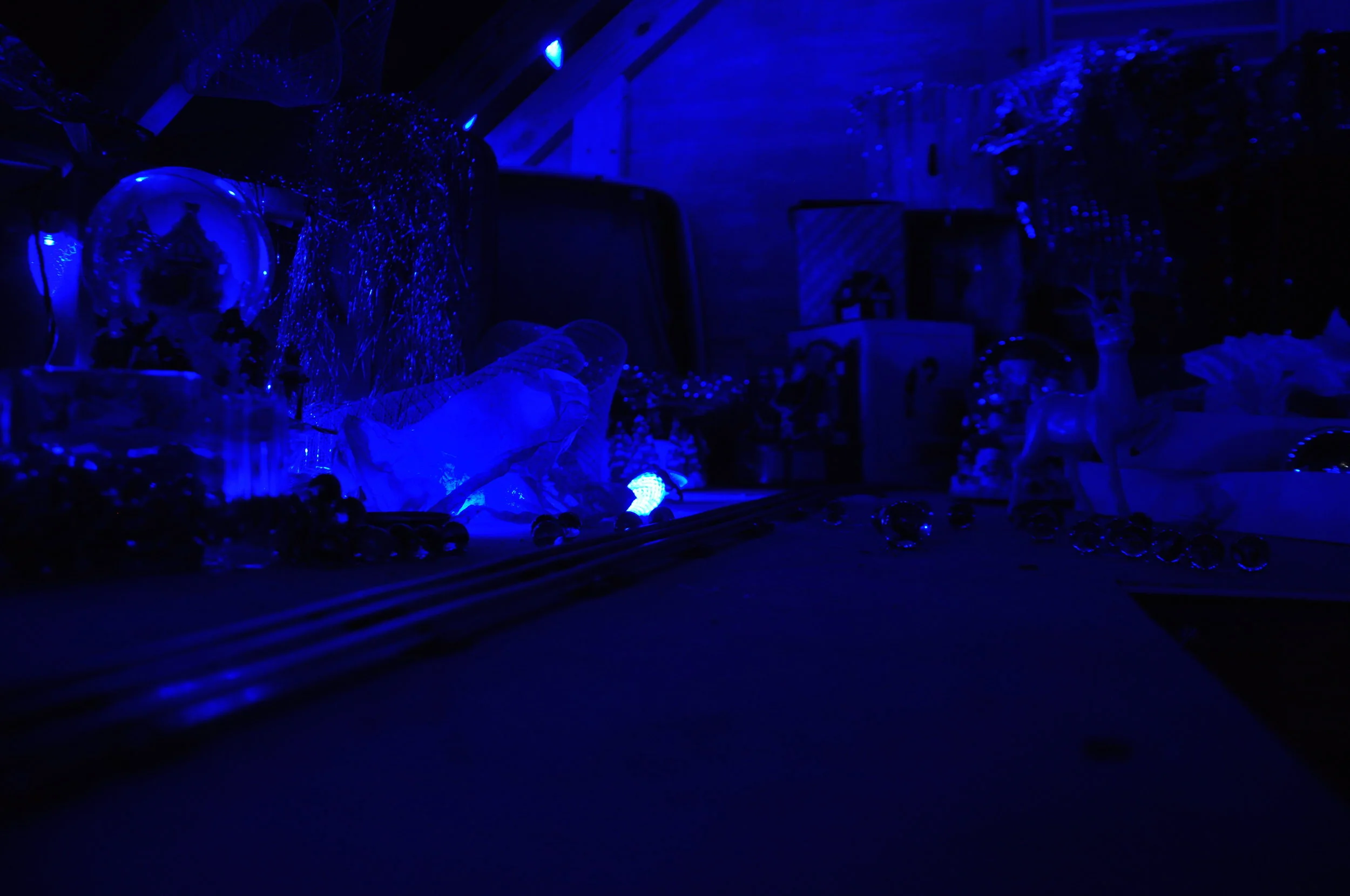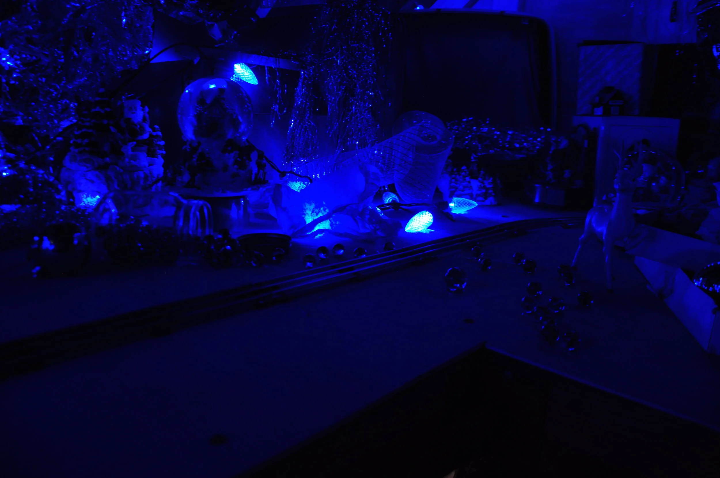 lumber, MDF siding, hardware, one hundred screen printed shingles, two hundred screen printed bricks, silver mylar, tinsel, assorted gift wrap, vintage rotating flood lamp, blue Christmas lights, vintage luggage, crates, cardboard boxes, vintage plastic deer, shattered shatterproof ornaments, assorted trinkets, motion-activated 1973 Lionel Cannonball train set, my mother's collection of twenty heirloom music boxes, audio (made in collaboration with Jordan Smith) composed of music box recordings, electric guitar, and various field recordings, vintage electric fireplace, 1958 Philco Golden Television, 1991 Television, electronics, vase of white lilies created from screen printed duplicates of my mother's death certificate