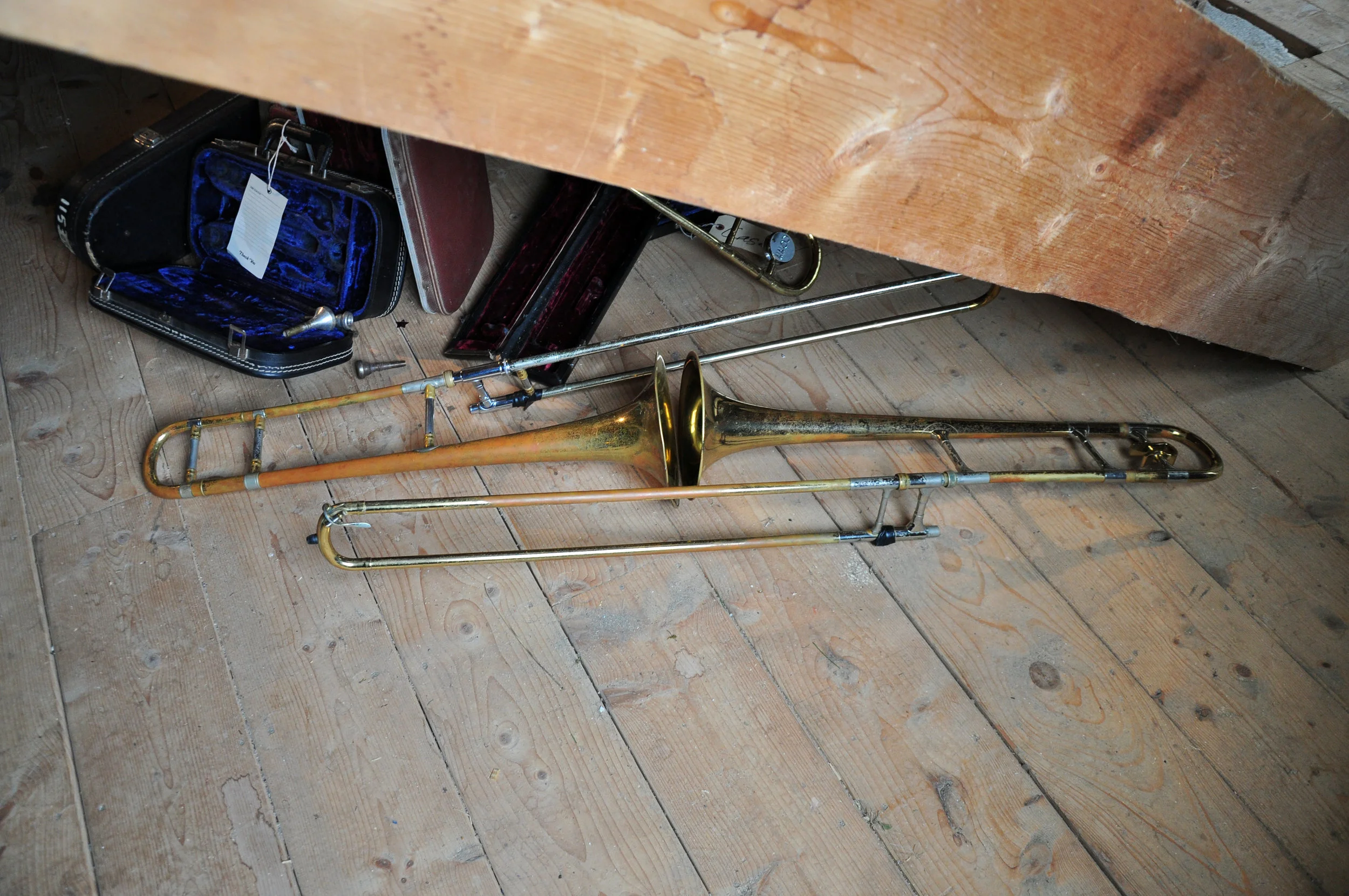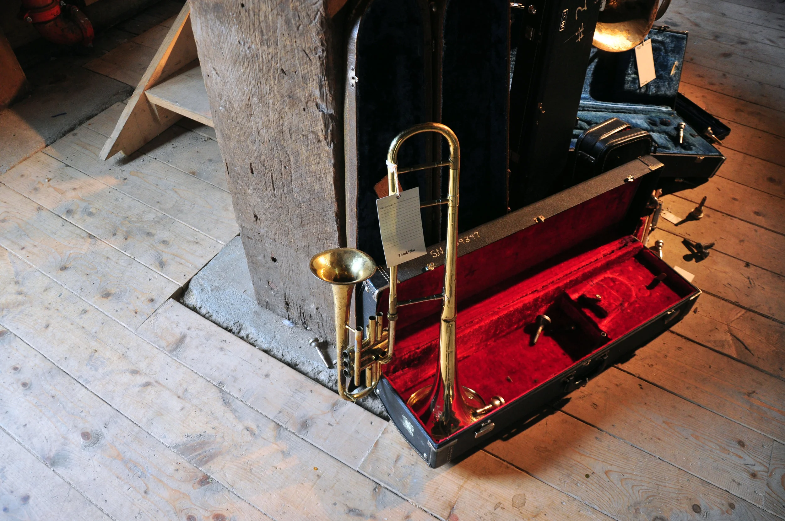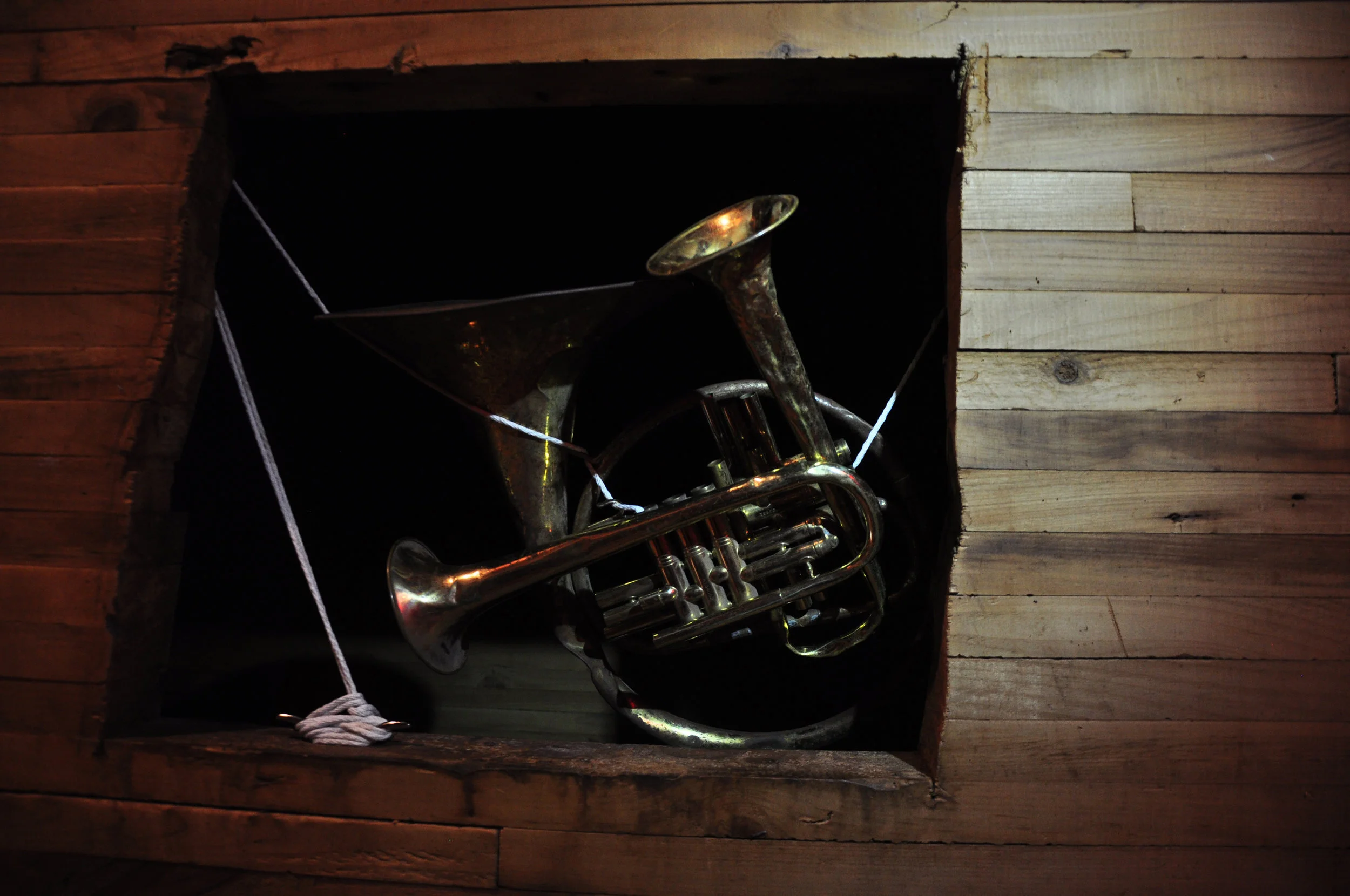 Dozens of second-hand brass instruments and cases collected in and around Tallahassee, FL, rope, lumber, hardware, vintage stage light, looping audio of field recordings from the Music Masters basement and samples from Kermit Schafer's All Time Great Bloopers Volume 1 vinyl record (duration 17 min.), screen printed repair tags