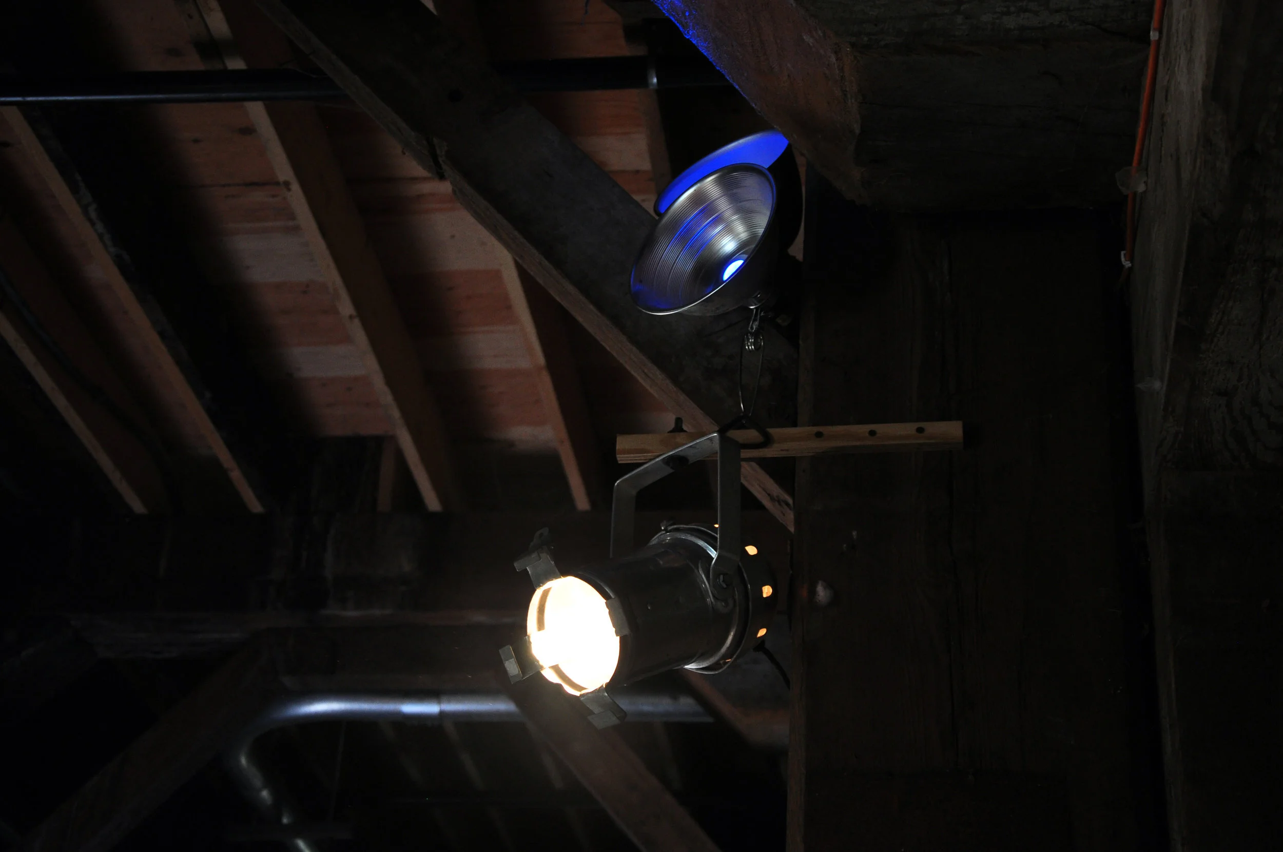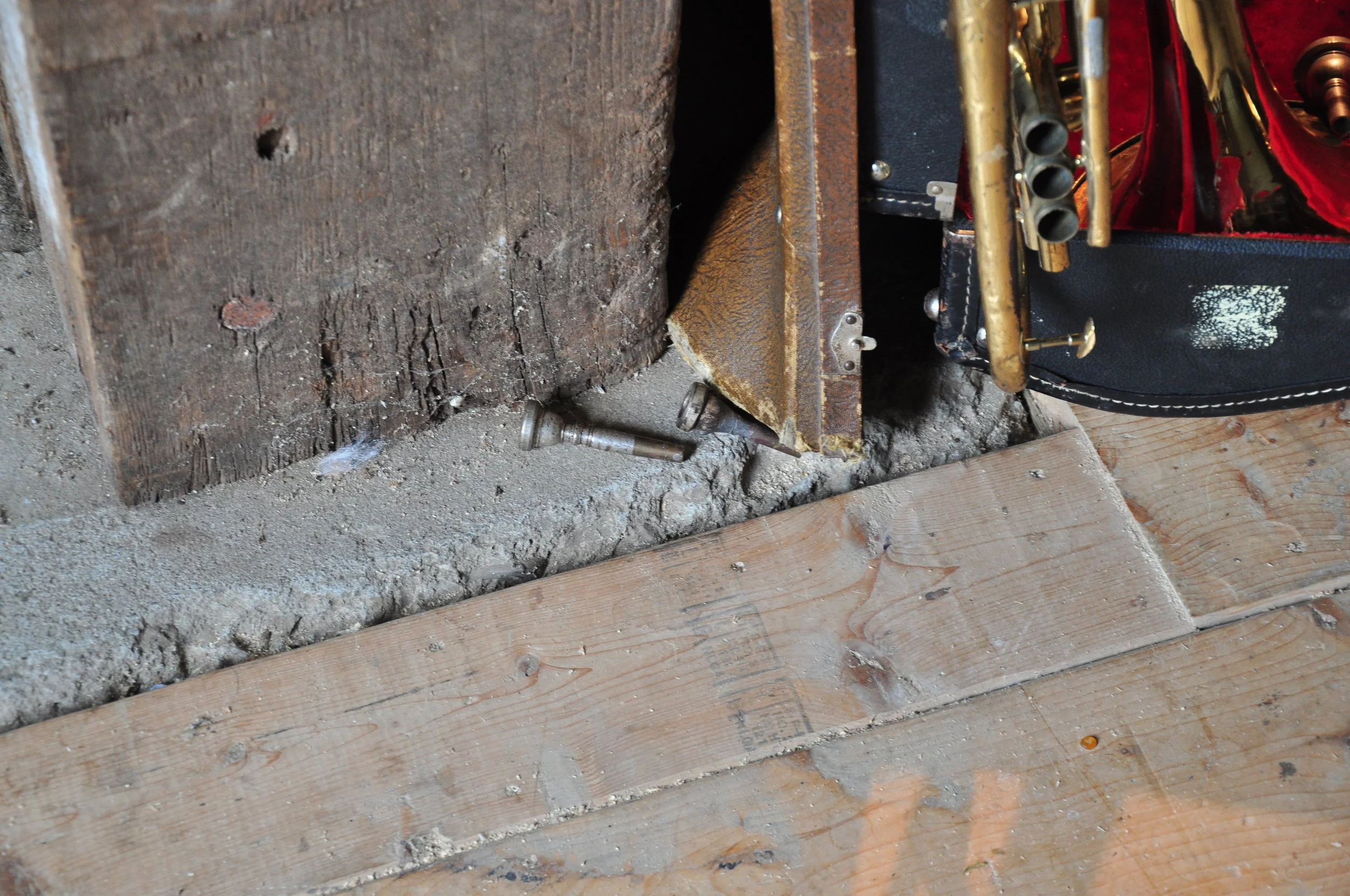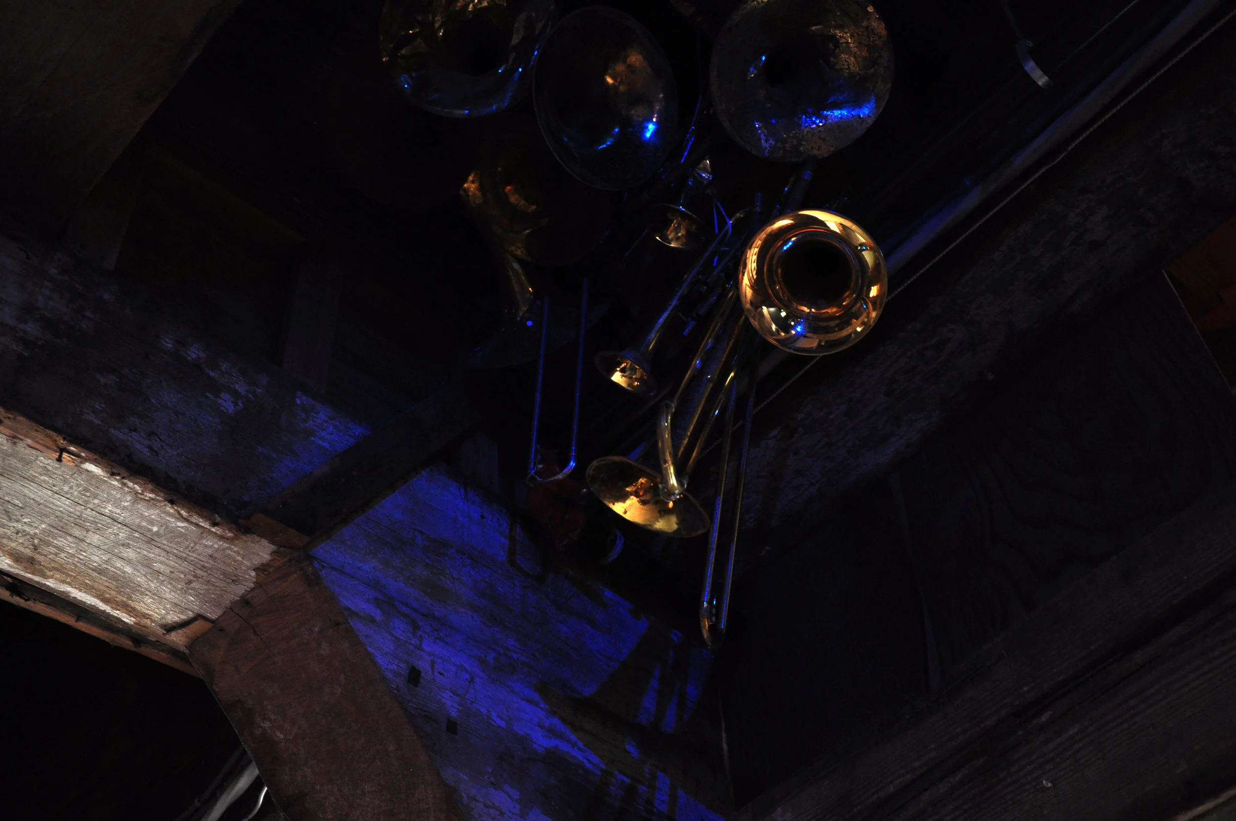 Dozens of second-hand brass instruments and cases collected in and around Tallahassee, FL, rope, lumber, hardware, vintage stage light, looping audio of field recordings from the Music Masters basement and samples from Kermit Schafer's All Time Great Bloopers Volume 1 vinyl record (duration 17 min.), screen printed repair tags