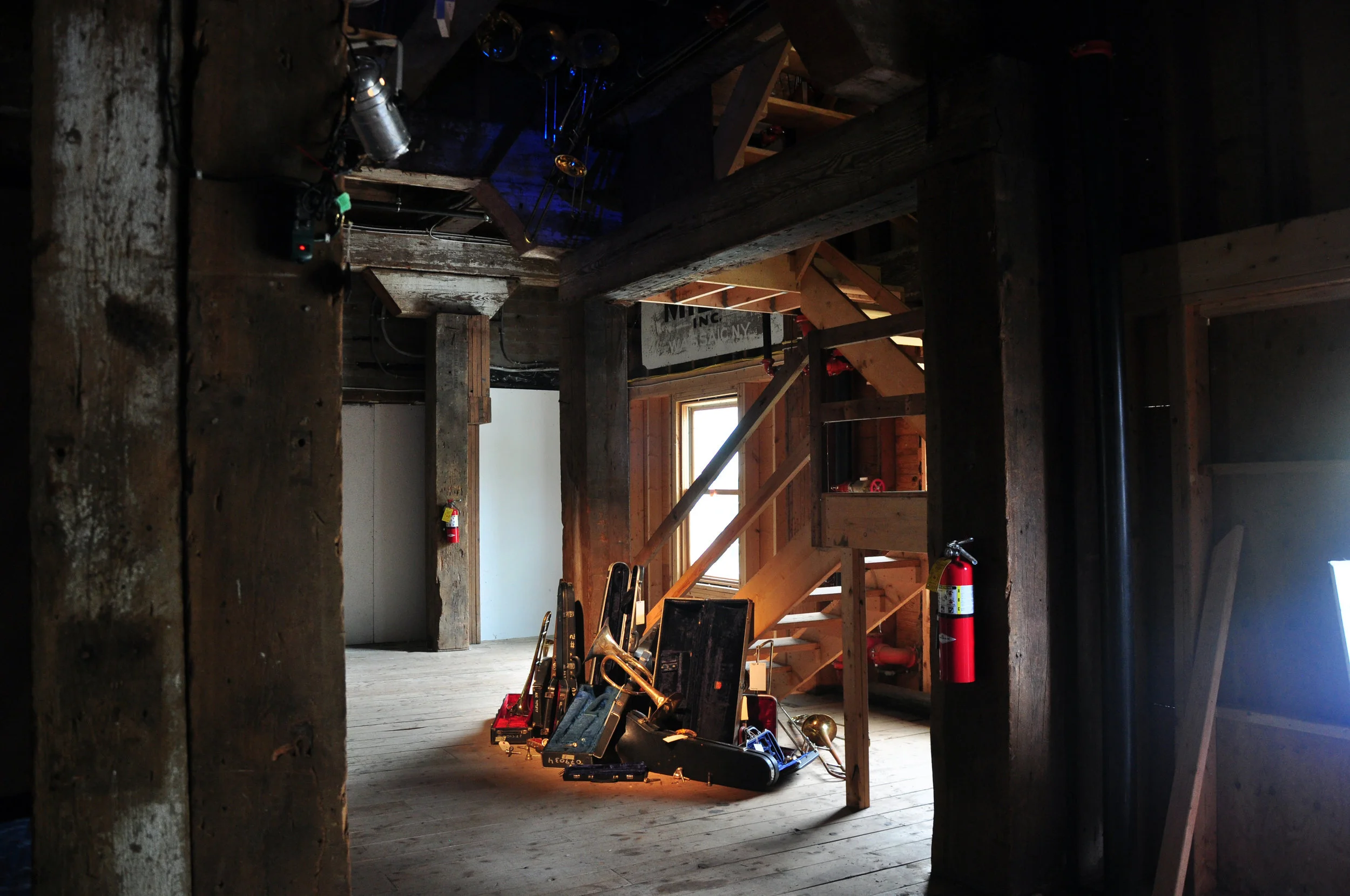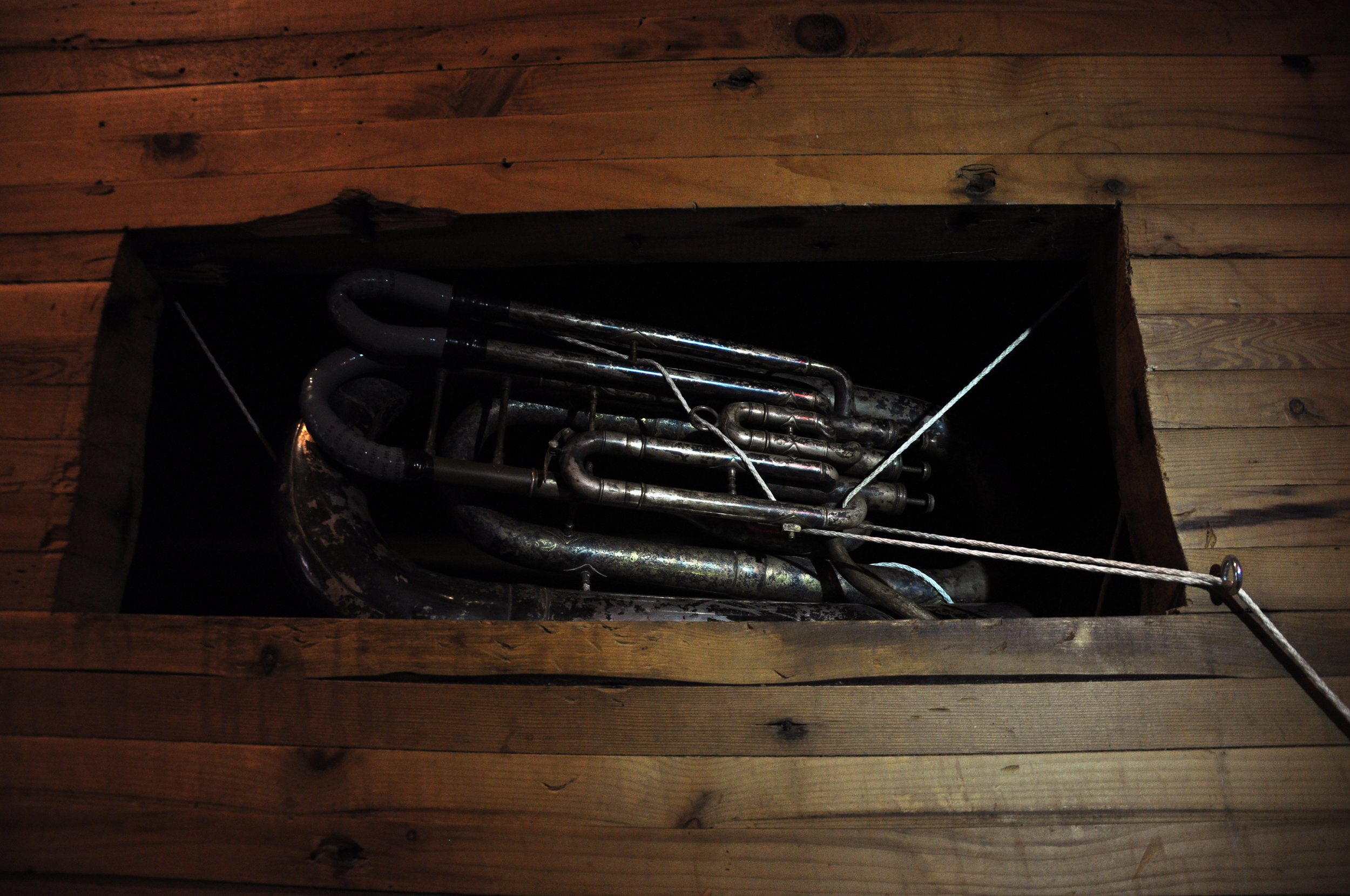 As you ascend the spiraling wooden staircase, each landing has a small window into the elevator shaft in which brass instrument sculptures were suspended.